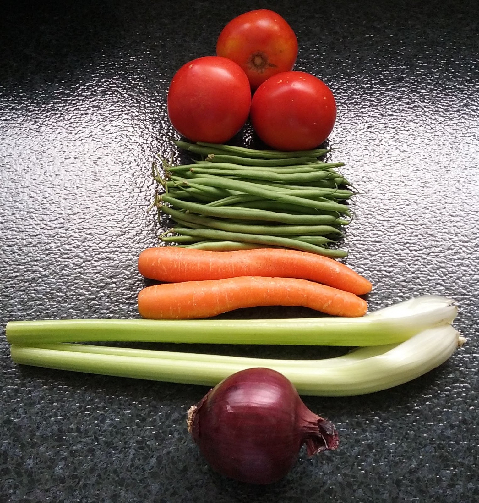 4. Ahora vamos con la cebolla. Pelar y picar la cebolla a cubitos muy pequeños (menos las judías verdes que las dejo enteras, todo va picado muy pequeñito).