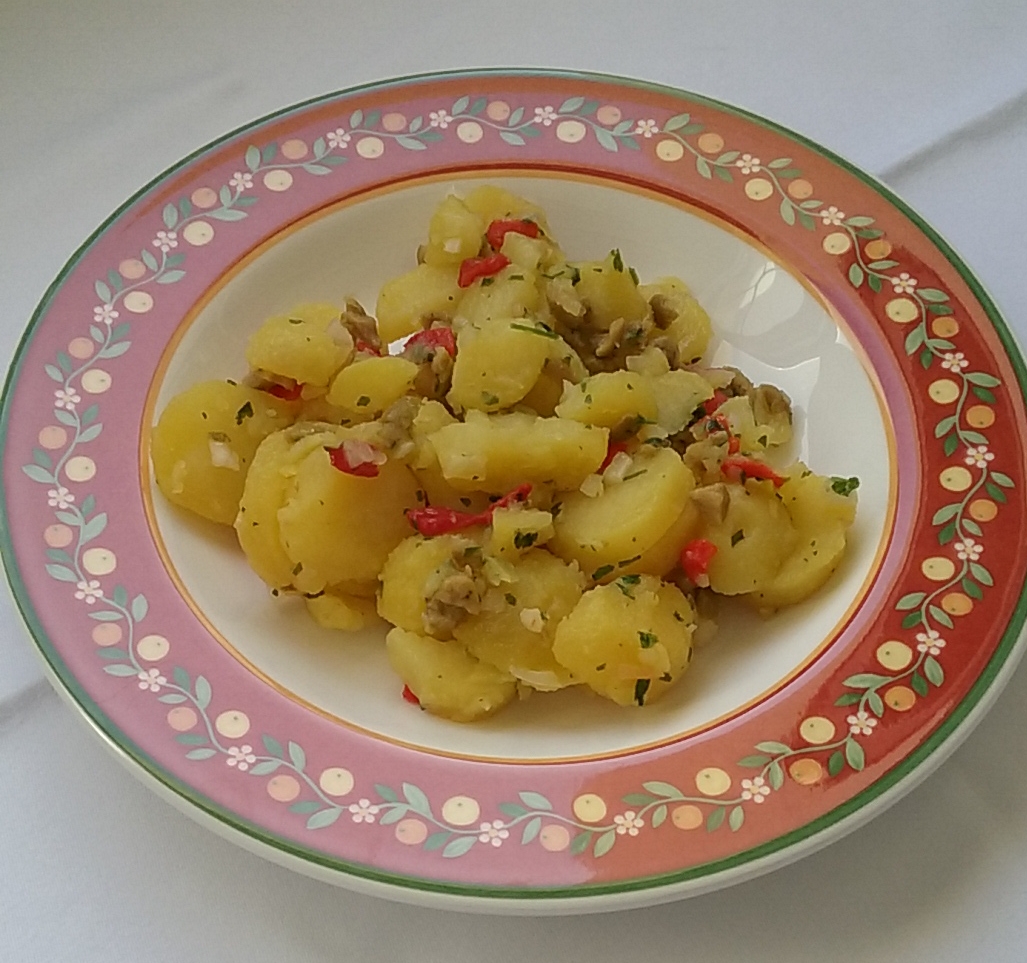 Es una ensalada que lleva patatas cocidas, perejil fresco, cebolla dulce, huevos cocidos, aceite de oliva, sal y vinagre. La versión aproteica la hago sin el huevo, añadiéndole aceitunas verdes y pimiento morrón o del piquillo en conserva para aportar algo más de color y sabor.